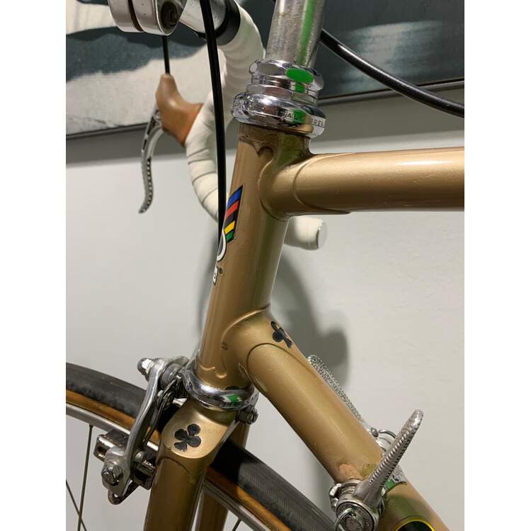 Early, very authentic Colnago Super with beautiful Colnago engravings. Magnifying glass Campagnolo Record/Super Record equipment. Very rare to find in this combination. The bike has been technically completely reworked, patinated, original paint with some "contemporary" paint touch-ups.