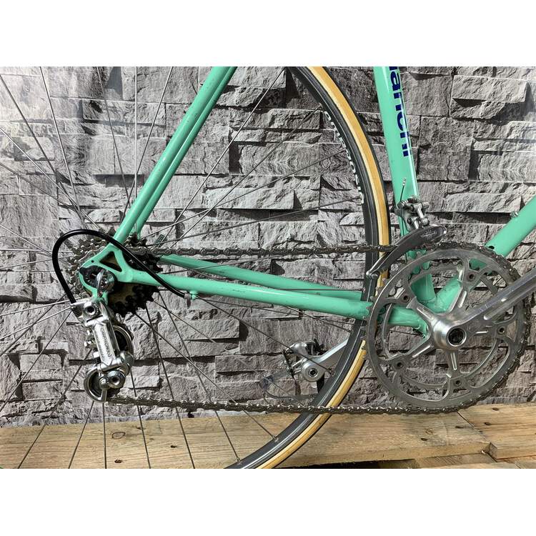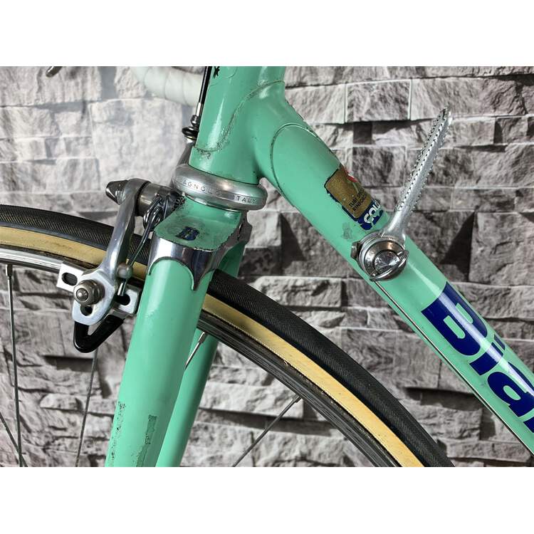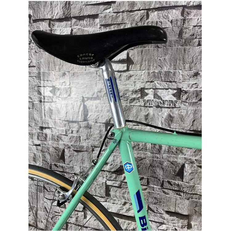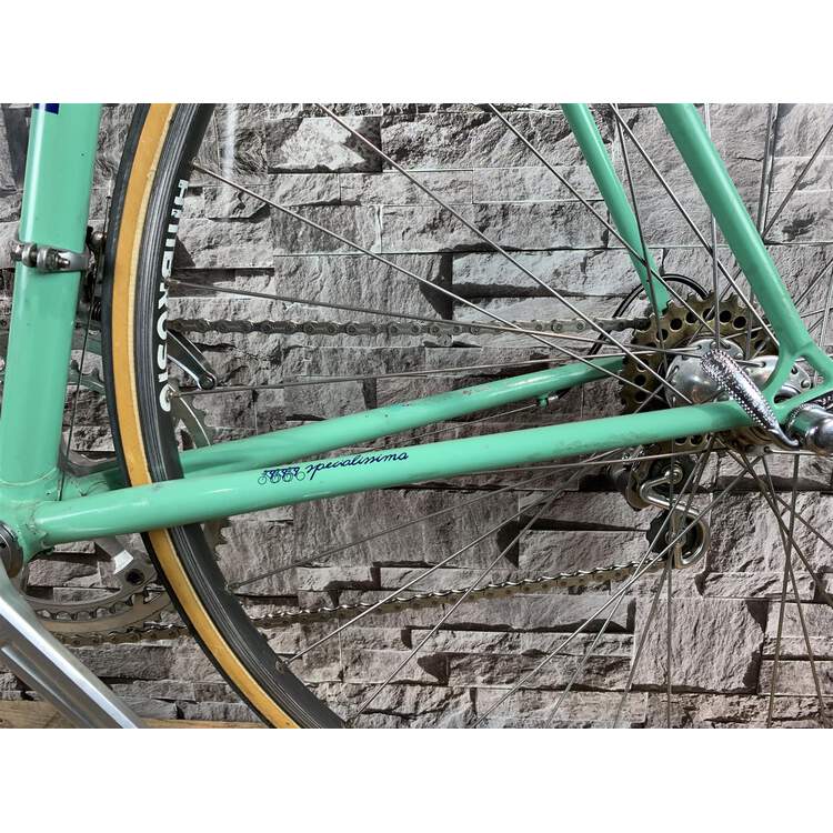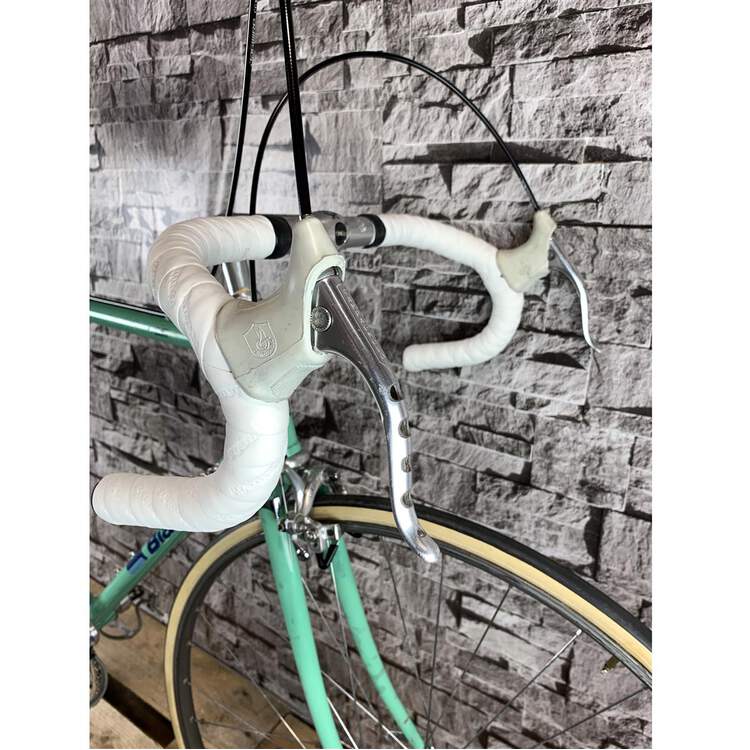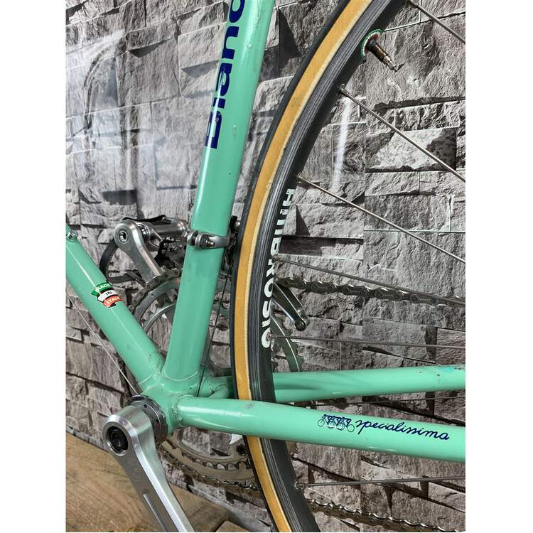 Bianchi Specialissima; die Spezifikation entspricht dem 70er "must have": Komplette Campagnolo Record/Super Record Gruppe; auf Wunsch wurden Open Mavic MA40 Felgen und vebaut mit Challenge Paris Roubaix 27mm Reifen kombiniert; San Marco Super Corsa Sattel. Die Campagnolo Super Record Sattelstütze, der 3TTT Vorbau und das Campagnolo Super Record Kettenblatt sind graviert. Ein vollständiger topp Bianchi Renner.Differenzbesteuerung nach §25a UStG.